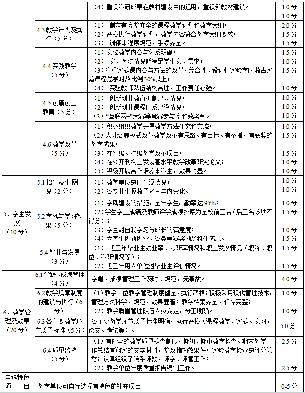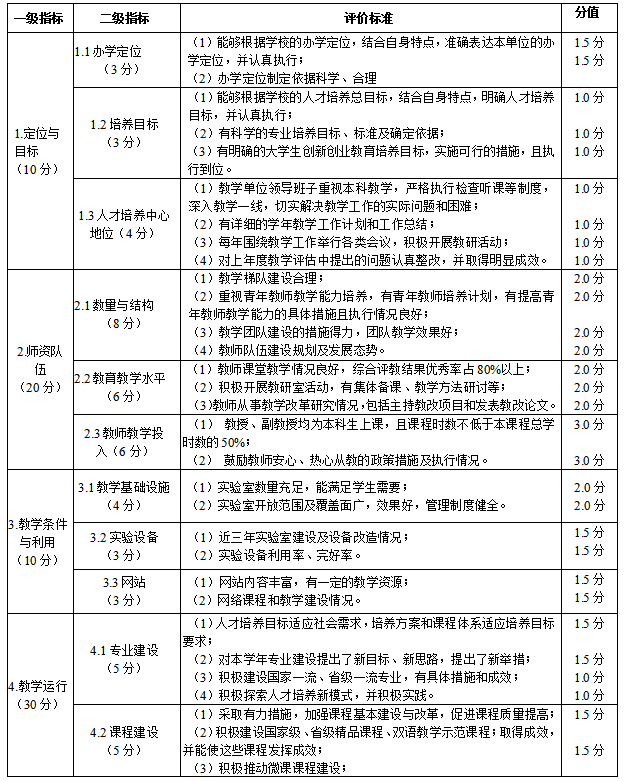 五、结论核定 1.评估结论分为优秀、良好、合格、不合格四个等级,其中:优秀为总分在90分以上,良好为总分在80~89分之间,合格为总分在60~79分之间,不合格为低于60分者。 2.教学单位本科教学工作评估结果将作为学校对单位年度综合评估的依据,并作为学校次年对各教学单位在经费投入、人才引进、专业申报、招生计划等有关工作的重要依据。 一、评估目标 以“学生中心、产出导向、持续改进”理念为指导,深入贯彻落实全国教育大会和本科教育工作会议精神,聚焦立德树人根本,发挥内部评估的导向、诊断、调控和改进功能,促使各教学单位进一步深化教学改革,优化专业结构,突出特色发展,加强内涵建设,强化人才培养中心地位,巩固本科教学的基础地位,全面提高教育教学水平和人才培养质量。 二、基本原则 (一)导向性原则 根据专业定位和人才培养目标,分析建设现状,发现问题,找出解决方案,引导本科各专业科学发展。 (二)实证性原则 依据事实作出判断,依据数据采集和分析做出考核,以数据为基础,以事实为依据。 (三)主体性原则 以教学单位自我评估,自我检查和自我改进为主,以专家评估,专家考察和专家反馈为辅,体现二级教学单位在专业建设和人才培养当中的主体地位。 (四)主次性原则 重点评估影响和制约我校本科专业发展的关键性因素,重点考察实力较为薄弱的新办专业和发展缓慢的非优势专业,重点体现专业人才培养目标和培养效果的契合度。 (五)多元化原则 坚持多元的考察视角,把专业建设的历史背景和建设现状的考察结合起来考察,把办学条件、教学过程和教学效果结合起来,把社会需求和学生成长与发展的考察结合起来,把专业现状和发展规划的考察结合起来。 三、评估的对象及分组 (一)评估对象 学校现有在招的本科专业。依据国家本科专业目录,设有专业方向的专业归并到原专业接受评估。 (二)评估分组 按照“分类评估、分类指导”的原则,根据学科性质,分为医学组和非医学组。 四、评估工作程序 (一)自评阶段 根据学校专业评估指标体系,各教学单位对专业建设和发展现状进行全面总结,收集有关背景资料和佐证材料,撰写专业评估自评报告,报教育教学质量监控与评价中心,同时准备好校级评估的相关材料备查。 (二)专家评估 1.教育教学质量监控与评价中心组织召开校级评估专家组会议,进行校级评估。 2.评估专家组成员审阅各教学单位上报材料。 3.专家组深入教学单位全面考察。专家组采取查看资料、听取汇报、随机听课、深入访谈、座谈会等形式,根据教学单位提供的自评报告给出最终评价意见和结论。 4.专家组向校评估领导小组汇报评估结果,经校评估领导小组组长签署意见报校长办公会审议后通报全校。 (三)整改阶段 1.各教学单位根据评估专家组的意见,针对存在的不足提出整改措施,上报教育教学质量监控与评价中心备案。 2.对评估不合格的教学单位,限期整改,并提交整改方案,整改后向教育教学质量监控与评价中心上报整改报告,接受学校整改验收。 3.学校根据评估结果,通过简报等形式推广先进经验,对优良状态的专业进行表彰和奖励。 五、指标体系第三章 本科专业评估