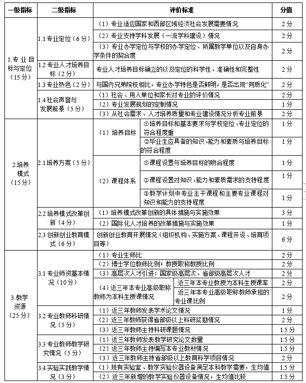 1.根据党的教育方针、新时代社会发展对本科人才培养的要求和现阶段我国高等教育教学改革的基本走势与发展趋势,设定评估指标及权重。
