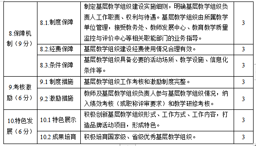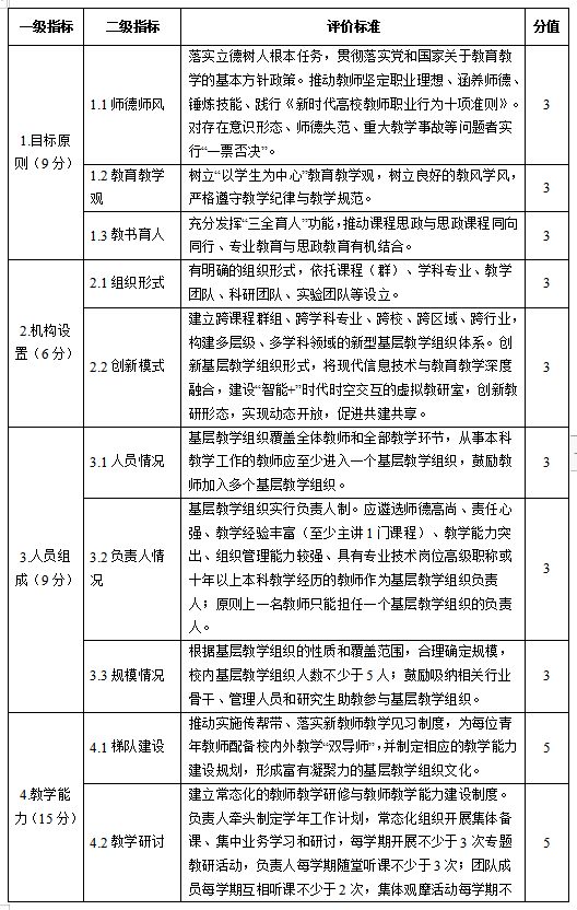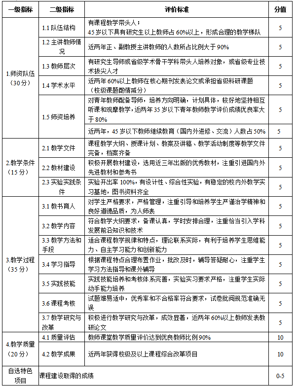 六、结论核定 1.评估结论分为优秀、良好、合格、不合格四个等级,其中:优秀为总分在90分及以上,良好为总分在80~89分之间,一般为总分在60~79分之间,较差为低于60分者。 一、评估目标 为进一步加强我校课程改革与建设,对课程开展的有效性和教育价值进行研判,为教学活动的不断改善和进步提供依据,提高教学质量和课程建设水平,推动人才培养质量的不断提升。 二、基本原则 1.评价理念上突出“学生中心”的价值导向。关注学生发展,注重学习成果,强调每一个学生都能够达到成果要求。学生中心的理念应当贯穿在评价体系的构建、反馈等各个阶段。 2.评价模式上体现产出导向的全程控制。以学习产出为动力,把学生的学习产出作为主要的评价对象,基于产出导向,对课程教学各个环节进行全过程评价,进而促进产出导向的全过程监控。 3.评价内容上聚焦持续改进的评判价值。以学生学习质量为评价基础,聚焦学生学习成果,将学生课程学习目标、毕业要求、培养目标等作为评价内容的重点,从评价体系、方法、过程、反馈等方面予以重点关注,采取多主体、多维度的综合评价策略,进而促进学生学习成果的增值以及持续改进。 4.评价体系要基于持续改进的长效机制。构建起评价闭环,促进课程评价“反哺”课堂教学,解决教学实践中的实际问题,进而通过评价系统的循环应用,推动教学质量的不断提升。 三、评估工作程序 (一)自评阶段 根据学校课程评估指标体系,各教研室(课程)对课程建设和发展现状进行全面总结,收集有关背景资料和佐证材料,撰写课程评估自评报告,报教育教学质量监控与评价中心,同时准备好校级评估的相关材料备查。 (二)专家评估 1.教育教学质量监控与评价中心组织召开校级评估专家组会议,进行校级评估。 2.评估专家组成员审阅各教研室(课程)上报材料。 3.专家组深入各教研室(课程)全面考察。专家组采取查看资料、听取汇报、随机听课、深入访谈、座谈会等形式,根据各教研室(课程)提供的自评报告给出最终评价意见和结论。 4.专家组向校评估领导小组汇报评估结果,经校评估领导小组组长签署意见报校长办公会审议后通报全校。 (三)整改阶段 1.各教研室(课程)根据评估专家组的意见,针对存在的不足提出整改措施,上报教育教学质量监控与评价中心备案。 2.对评估不合格的课程,限期整改,并提交整改方案,整改后向教育教学质量监控与评价中心上报整改报告,接受学校整改验收。 3.学校根据评估结果,通过简报等形式推广先进经验,对评估优秀的课程进行表彰和奖励。 四、指标体系 五、结论核定 1.评估结论分为精品课程、优质课程、合格课程和不合格课程。其中:精品课程为总分在90分以上,优质课程为总分在89~79分之间,合格课程为总分在60~79分之间,不合格课程为低于60分者。 一、评估目标 坚持以习近平新时代中国特色社会主义思想为指导,落实立德树人根本任务,充分认识加强基层教学组织建设提升教师教学能力的重要性,进一步筑牢教学工作中心地位,形成基层教学组织建设与教师教学能力提升新模式,推动学校教育现代化。 二、基本原则 (一)坚持立德树人 坚持正确的政治方向,立足培养五育并举的社会主义建设者和接班人这一根本任务,推动基层教学组织切实担当起为党育人为国育才使命。 (二)坚持分类发展 准确把握高等教育基本规律和人才成长规律,遵循学科专业建设规律,完善教师教学能力建设新机制,探索基层教学组织分类指导、分类推进、特色发展新模式。 (三)坚持协同育人 以提升教师教学能力为抓手,加强科教、产教融合发展,丰富新型基层教学组织形态,建立优质资源共享平台,培育一批教学研究和改革实践成果,推动健全教学能力提升长效机制。 三、评估工作程序 (一)自评阶段 根据学校基层教学组织评估指标体系,各基层教学组织对建设和发展现状进行全面总结,收集有关背景资料和佐证材料,撰写评估自评报告,报教育教学质量监控与评价中心,同时准备好校级评估的相关材料备查。 (二)专家评估 1.教育教学质量监控与评价中心组织召开校级评估专家组会议,进行校级评估。 2.评估专家组成员审阅各基层教学组织上报材料。 3.专家组深入各基层教学组织全面考察。专家组采取查看资料、听取汇报、随机听课、深入访谈、座谈会等形式,根据各基层教学组织提供的自评报告给出最终评价意见和结论。 4.专家组向校评估领导小组汇报评估结果,经校评估领导小组组长签署意见报校长办公会审议后通报全校。 (三)整改阶段 1.各基层教学组织根据评估专家组的意见,针对存在的不足提出整改措施,上报教育教学质量监控与评价中心备案。 2.对评估不合格的基层教学组织,限期整改,并提交整改方案,整改后向教育教学质量监控与评价中心上报整改报告,接受学校整改验收。 3.学校根据评估结果,通过简报等形式推广先进经验,对评估优秀的基层教学组织进行表彰和奖励。 四、指标体系2.评估结果实行专业预警,为专业建设,招生政策及经费投入程度提供科学依据。