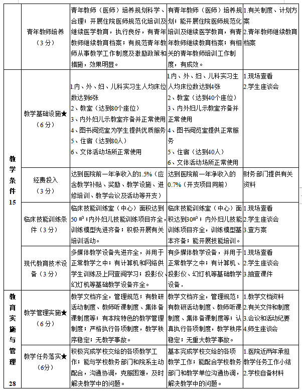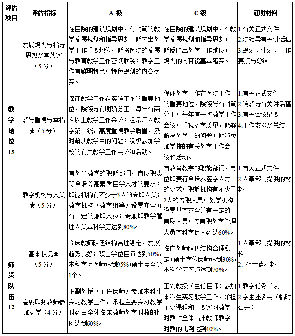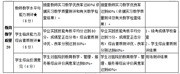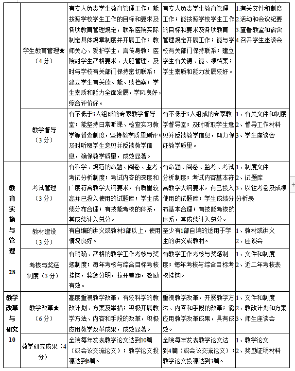 五、结论核定 1.评估结论分为优秀、良好、合格、不合格四个等级,其中:优秀为总分在90分及以上,良好为总分在80~89分之间,一般为总分在60~79分之间,较差为低于60分者。 2.学校将基层教学组织考核和评选表彰结果,与各类评优评奖、教研教改申请、职称评审等挂钩。 第六章 实践教学(后期临床教学)基地评估 一、评估目标 1.加强医学院校的教学基地建设,提高医学人才培养质量既是教育部、卫生部的明确要求,也是学校和医院发展建设的内在需要。 2.高等医学教育规律的关键在于临床医学人才培养的后期教学必须在医院完成。长期以来,医院已成为高等医学院校特殊的重要组成部分,医院与医学院校是先天一体的双赢合作关系;教育教学职能,是医院自身具有的仅次于医疗职能的第二个重要社会职能。医院强化教育教学职能,既是为社会培养优秀医学人才,也是为自身培养人才,提高综合水平。 3.知识来源于实践,能力来自实践,素质更需要在实践中养成。医学是一门实践性很强的应用学科,大量的临床经验和知识必须靠学生在临床实践中获得和掌握。临床实践是医学教育极为重要的阶段,是培养学生独立思考、综合分析问题和解决问题能力的关键时期,临床实践教学基地的教学条件、师资队伍、教学质量直接影响到学生毕业后从事医疗工作的能力。建立稳定的临床教学管理机构和队伍,完善临床教学工作协调制度和机制,保证教学秩序,及时研究解决临床教学中的问题,是保证人才培养质量的需要。 二、评估范围 附属医院、非直属附属医院。 三、评估工作程序 (一)自评阶段 各教学医院根据实践教学(后期临床教学)评估指标体系要求,坚持“以医院建设为主、校院共建、共同发展”的原则进行自评。收集有关背景资料和佐证材料,撰写评估自评报告,向学校提出正式评估的书面申请。 (二)专家评估 1.对申请评估的医院,学校组织召开校级评估专家组会议,进行校级评估。 2.评估专家组成员审阅各教学医院上报材料。 3.专家组进行实地考察评估,得出评估结论与整改要求。 4.专家组向校评估领导小组汇报评估结果,经校评估领导小组组长签署意见报校长办公会审议后通报全校。 (三)整改阶段 1.各教学押韵根据评估专家组的意见,针对存在的不足提出整改措施,上报学校备案。 2.对评估不合格的教学医院,限期整改,并提交整改方案,整改后向学校上报整改报告,接受学校整改验收。 3.学校根据评估结果,通过简报等形式推广先进经验,对评估优秀的教学医院进行表彰和奖励。 四、评价指标体系 注:获得优秀实践教学(后期临床教学)基地的评估标准。 1.总分不低于90分; 2.10项关键指标至少有7项为B级标准及以上,关键指标须达到C级; 3.12项一般指标至少有10项必须达到C级标准及以上; 4.以上三项必须全部达到规定标准。 五、评估结果 1.优秀实践教学(后期临床教学)基地由学校行文公布,通过优秀评估的教学医院将由学校授予“陕西中医药大学优秀临床教学基地”的荣誉称号。 2.对成为“陕西中医药大学优秀临床教学基地”的教学医院,学校将给予一定的奖励,同时在师资培养、条件建设、教师聘任、参加学术交流、享受规定的有关待遇、申请科研与教学研究立项等方面给予政策倾斜。 第七章 附则 1.本办法由教育教学质量监控与评价中心负责解释。 2.本办法自2023年10月16日起施行。原《陕西中医药大学专项评估办法》(陕中大高教办〔2017〕8号)文件同时废止。 注:获得优秀实践教学(后期临床教学)基地的评估标准。 1.总分不低于90分; 2.10项关键指标至少有7项为B级标准及以上,关键指标须达到C级; 3.12项一般指标至少有10项必须达到C级标准及以上; 4.以上三项必须全部达到规定标准。 五、评估结果 1.优秀实践教学(后期临床教学)基地由学校行文公布,通过优秀评估的教学医院将由学校授予“陕西中医药大学优秀临床教学基地”的荣誉称号。 2.对成为“陕西中医药大学优秀临床教学基地”的教学医院,学校将给予一定的奖励,同时在师资培养、条件建设、教师聘任、参加学术交流、享受规定的有关待遇、申请科研与教学研究立项等方面给予政策倾斜。 第七章 附则 1.本办法由教育教学质量监控与评价中心负责解释。 2.本办法自2023年10月16日起施行。原《陕西中医药大学专项评估办法》(陕中大高教办〔2017〕8号)文件同时废止。
