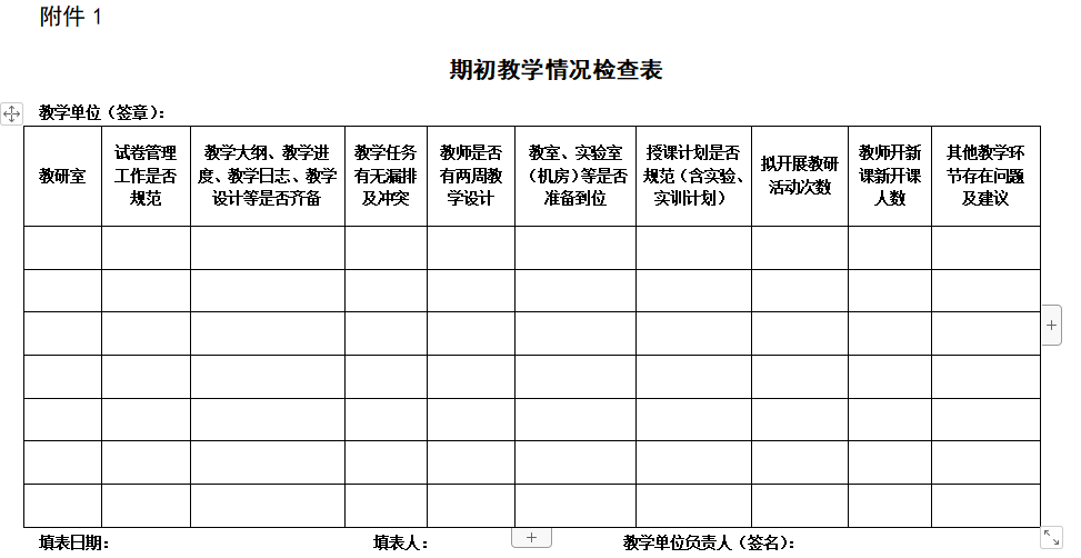2.各单位负责组织好本单位的期末教学检查工作,做好记录并填写《期初教学情况检查表》(附件1)《开课第一天到课情况统计表》(附件2)《基层教学组织教学法研究及集体备课活动计划》(附件3)。